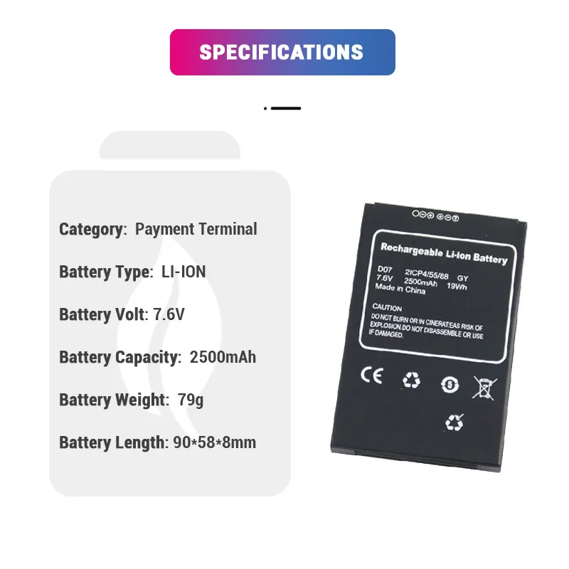 باتری لیتیوم یون قابل شارژ 7.6 ولت 2500 میلیآمپر ساعت D07 F20 برای دستگاه ترمینال فروش نقدی FEITIAN D07