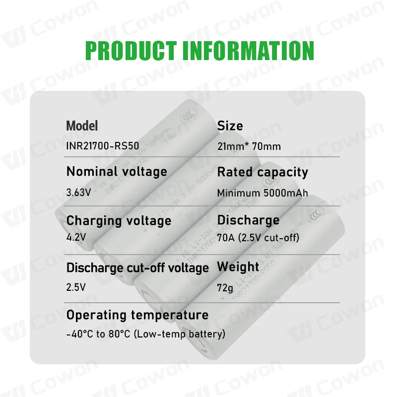 Low-temp -40°C High Rate 70A 3.7V 5000mah INR21700 RS50 Cylindrical Cell Li Ion Lithium Ion 21700 Battery